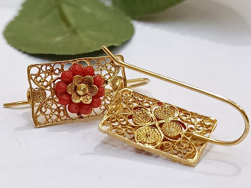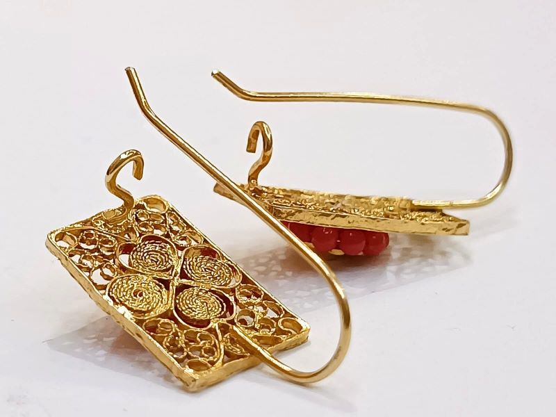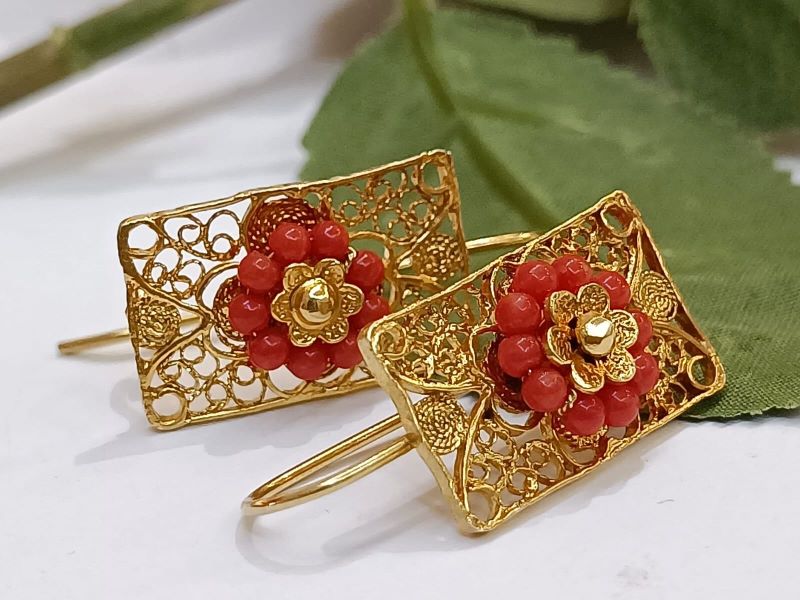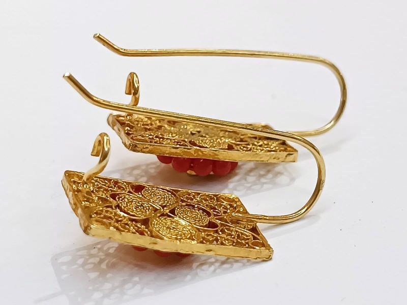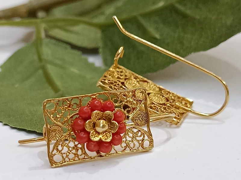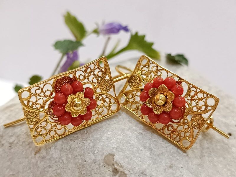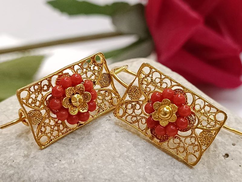 Elegantne i unikatne naušnice, ručno izrađene poznatom filigranskom tehnikom od Crvenog Jadranskog Koralja (Corallium Rubrum) i srebra 925 finoće. Kače se na uho pomoću pozlaćene udice zatvorenog tipa.