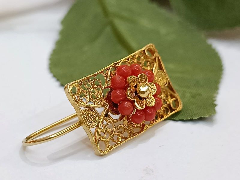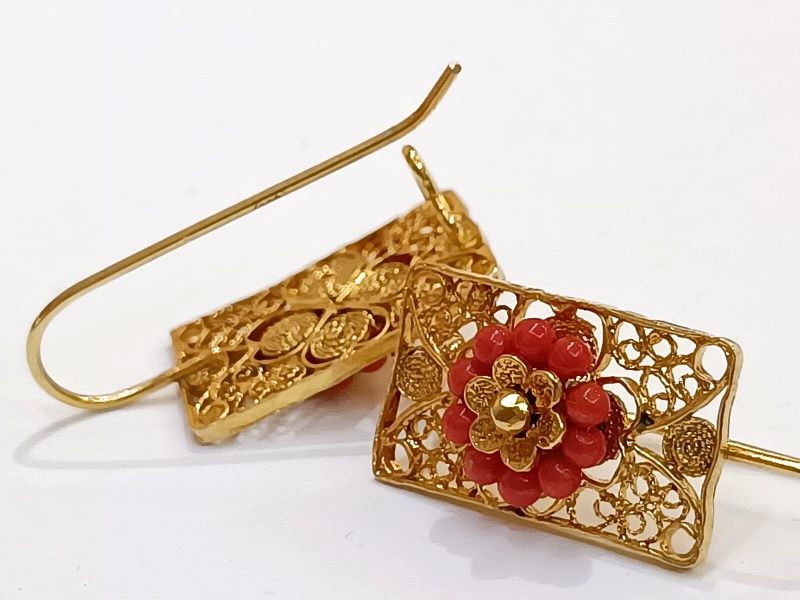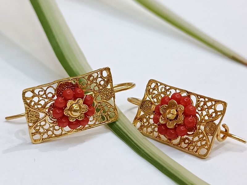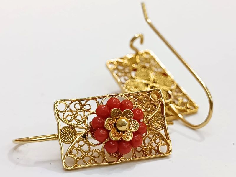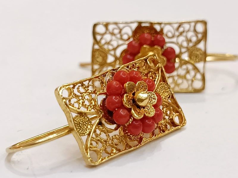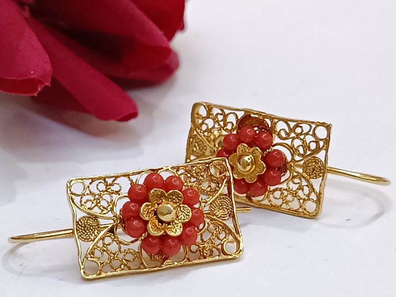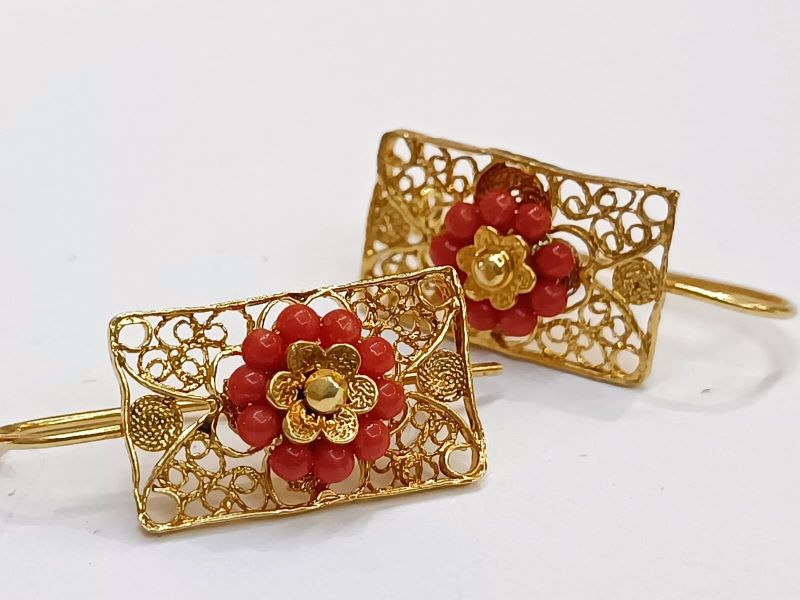 Elegantne i unikatne naušnice, ručno izrađene poznatom filigranskom tehnikom od Crvenog Jadranskog Koralja (Corallium Rubrum) i srebra 925 finoće. Kače se na uho pomoću pozlaćene udice zatvorenog tipa.