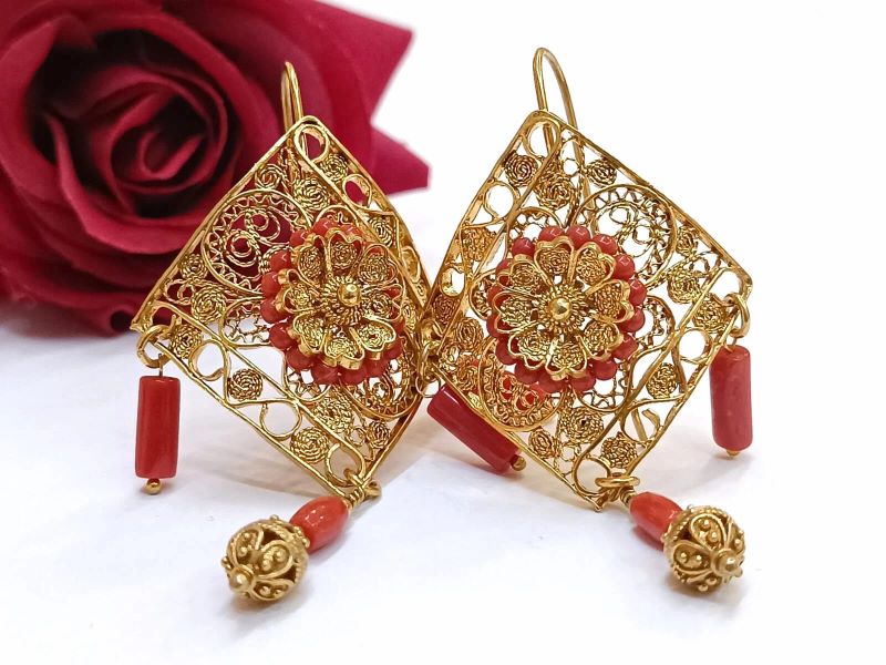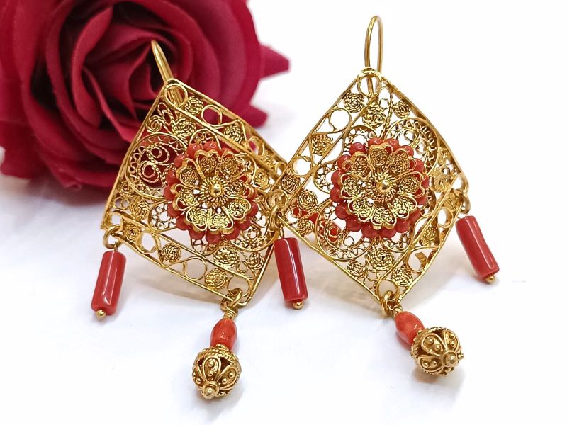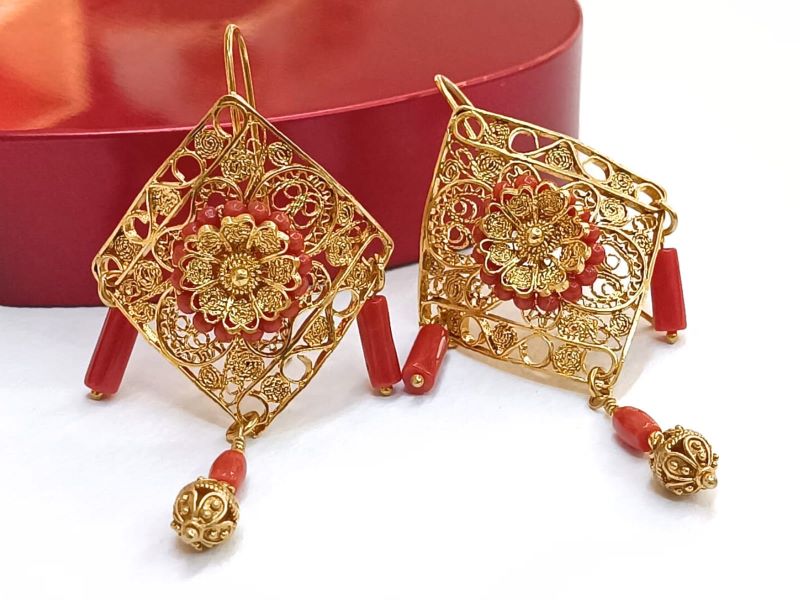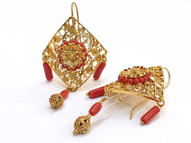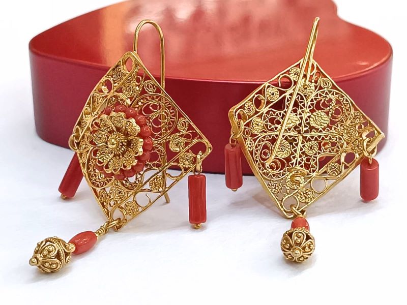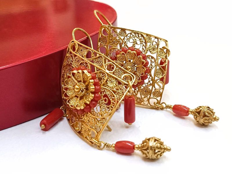 Unikatne i očaravajuće naušnice izrađene od crvenog Jadranskog Koralja (Corallium Rubrum) i srebra 925 finoće. Ručno su rađene tradicionalnom filigranskom tehnikom poznatih zlatara iz Omiša. Kopčaju se na udicu zatvorenog tipa.