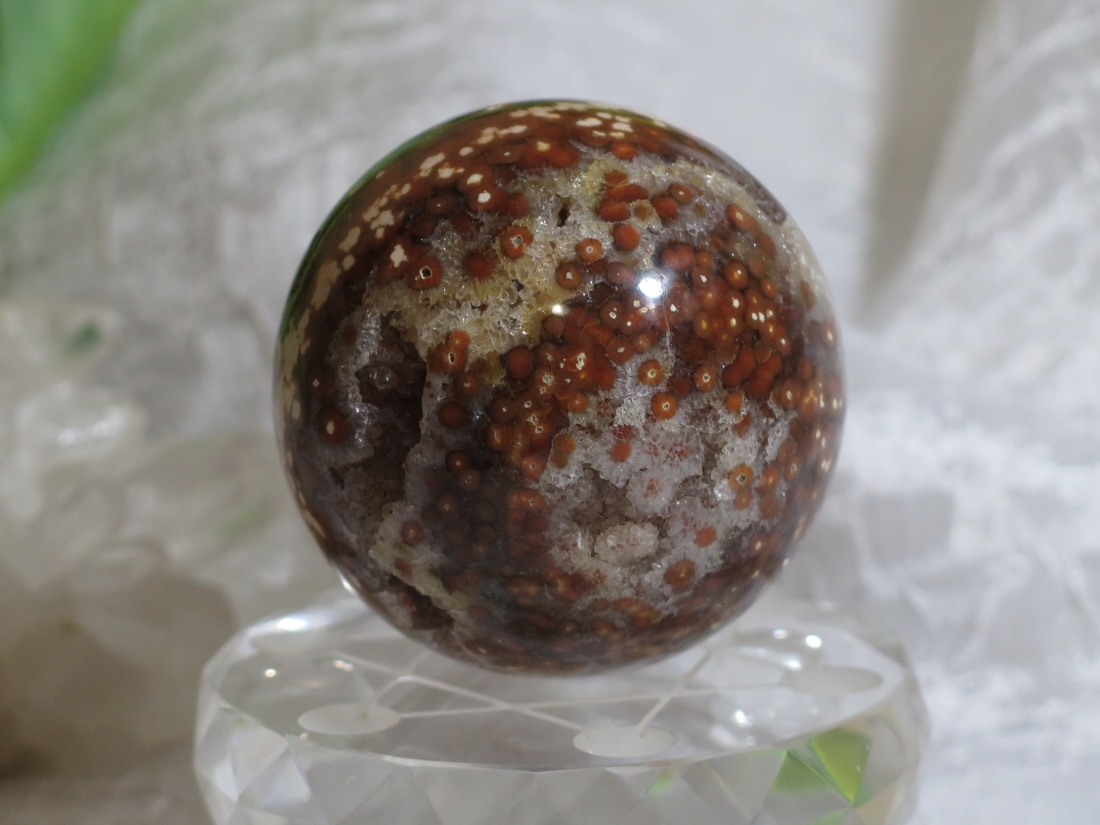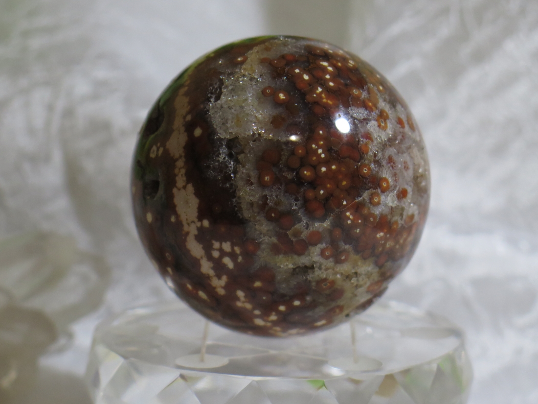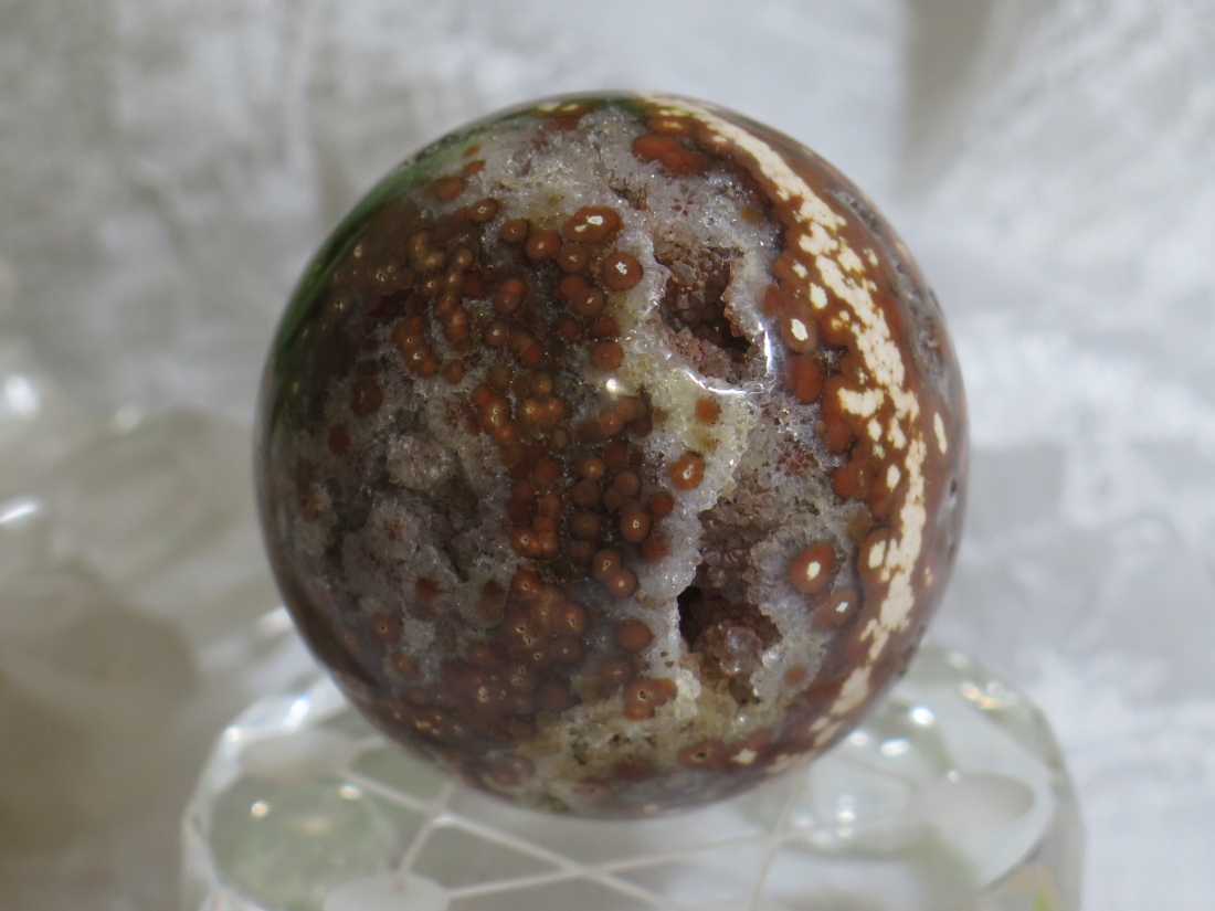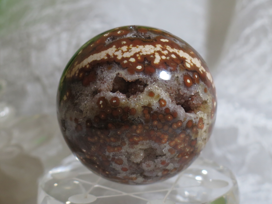 Kristal Ocean Jaspisa brušenog u obliku kugle. Unikatnih je mješavina smeđe i bijele boje s prirodnim brazdama u kojima su prisutni kristalići kvarca.