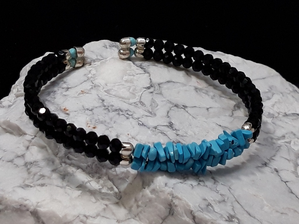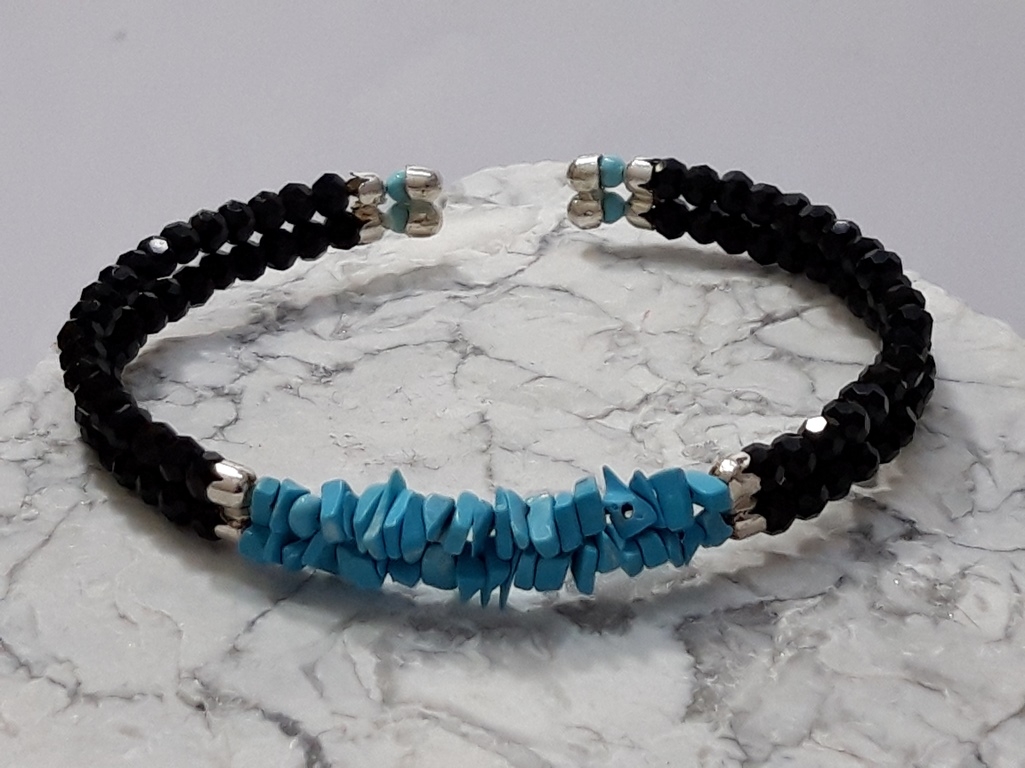 Zanimljiva srebrna narukvica izrađena od sitnih facetiranih perli poludragog kamena Oniksa i nepravilnih čipseva Tirkiza. Kuglice su nanizane u dva reda. Ures ne sadrži kopču i prilagodljivog je obujma. Minimalni unutarnji promjer joj je 5.30 cm. Ukrasni završetci su napravljeni od srebrna 925 finoće. Svoj primjerak možete kupiti za pristupačnu cijenu na stranicama Lotos online prodaje. Pregledajte bogatu ponudu ženskog i muškog nakita od srebra na našem web shopu. Ezoterično značenje i ljekovito djelovanje ovih zaštitničkih minerala saznajte na poveznici dolje.