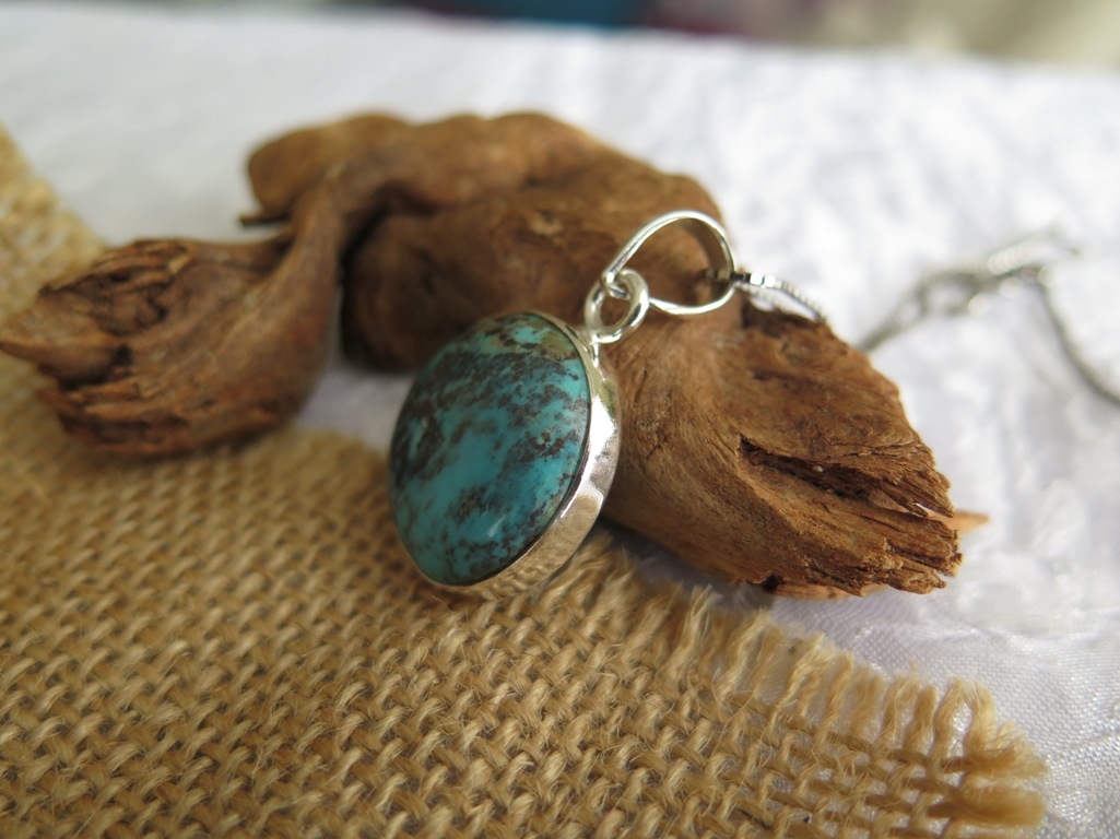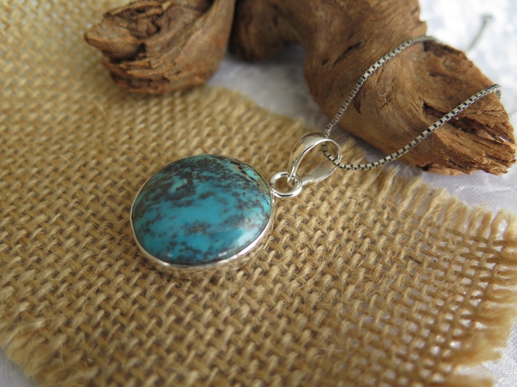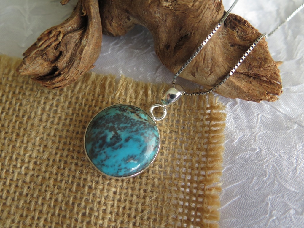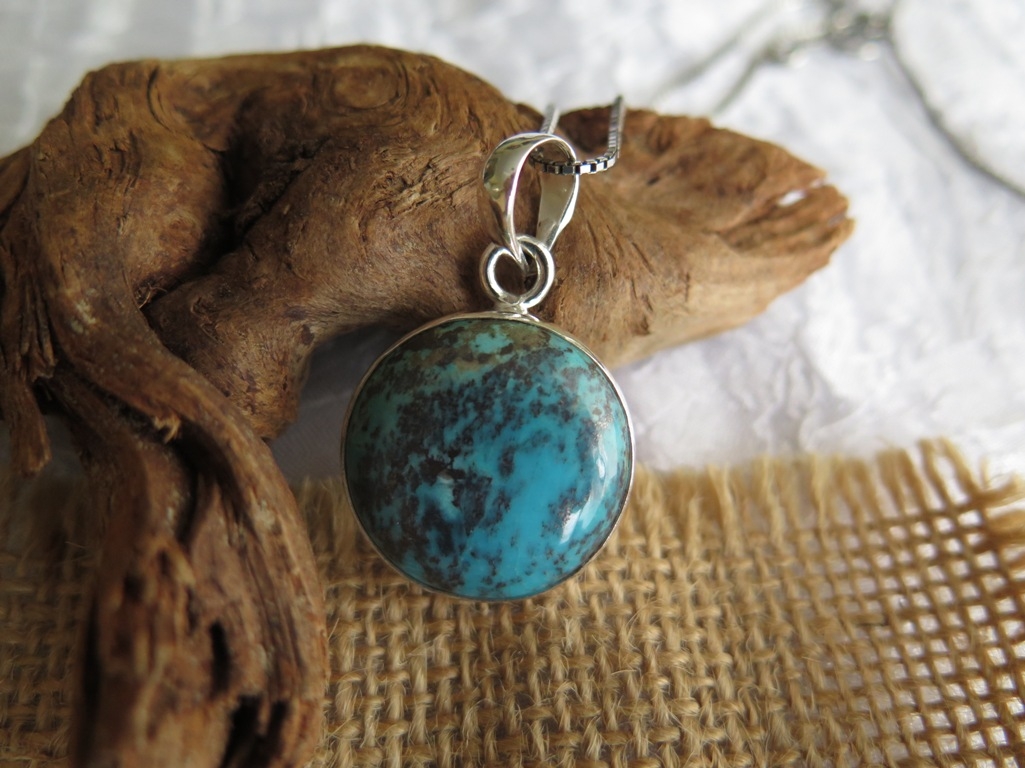 Na slikama je prikazan unikatan privjesak od prirodnog poludragog kamena Tirkiza iz nalazišta u Arizoni. Okrugli kristal je glatko poliran te lijepe plave boje u kombinaciji s izvornim smeđim šarama. One mu daju vintage izgled. Uglavljen je u okvir 925 finoće koji na vrhu ima alkicu širine 7 mm. Kožne trakice ili srebrni lančić možete kupiti preko stranica naše online prodaje za pristupačne cijene. Dobit ćete ures s fotografija. Istražite Lotos web katalog srebrnog nakita po super cijenama. Ljekovita svojstva i djelovanje ovog poznatog minerala saznajte na linku ispod teksta.