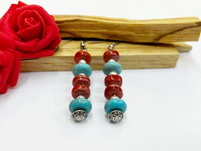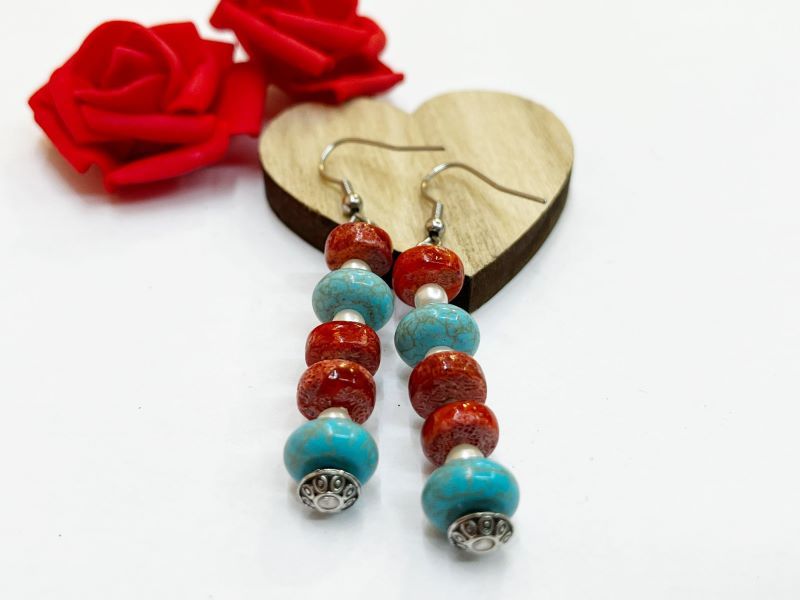 Zadivljujuće naušnice ručno osmišljene od poludragog kamena rekonstruiranog Tirkiza, zanimljiva oblika i lijepih plavih boja. Kombinirane su s crvenim koraljnim i bisernim komponentama, koje daju poseban šarm naušnicama. Vrlo su elegantne, lagane i ugodne za nošenje, a zasigurno će izmamit osmjeh na lice. Inspiriraj se i idejom za poklon voljenoj osobi. Nepogrešiv izbor za sve prilike.
